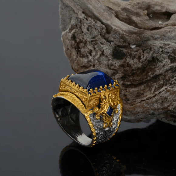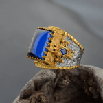 Turkish Handmade Blue Sapphire Stone Ring—925 Silver Gold Plated with Patterned Design, Gemstone Ring for Men.